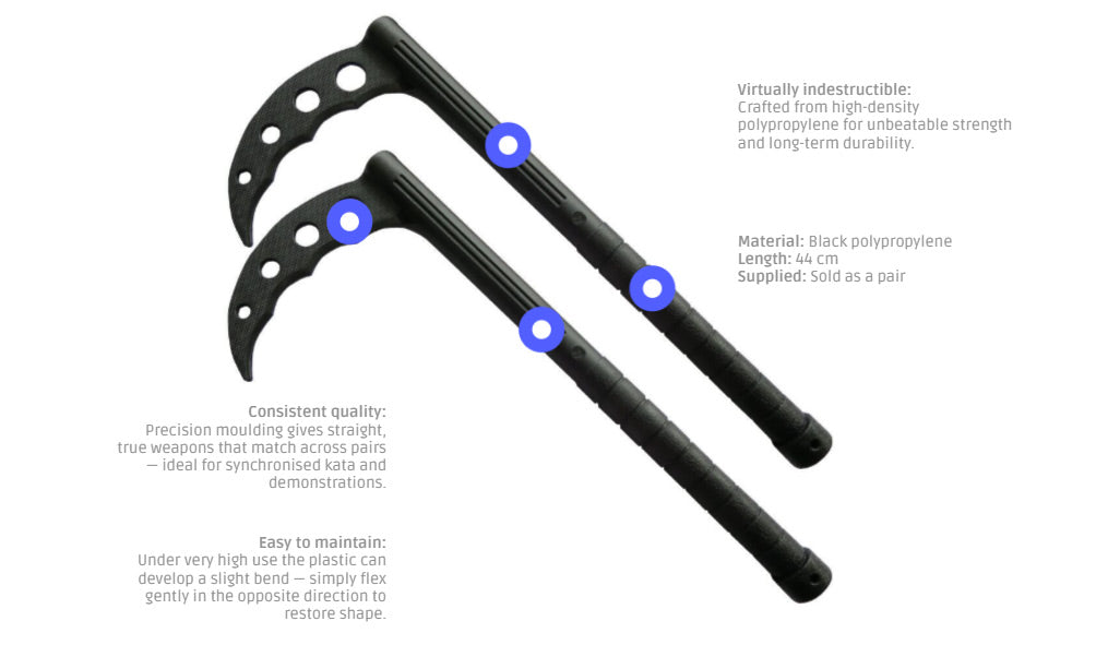 The Morgan Sports Training Kama are moulded from heavy-duty polypropylene specifically for full-contact practice. Tougher and more consistent than timber, the polypropylene construction delivers reliable performance session after session while remaining safe for partner work.