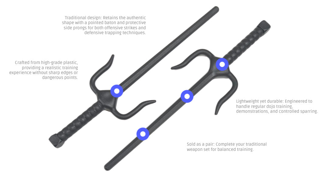 - Traditional design: Retains the authentic shape with a pointed baton and protective side prongs for both offensive strikes and defensive trapping techniques.